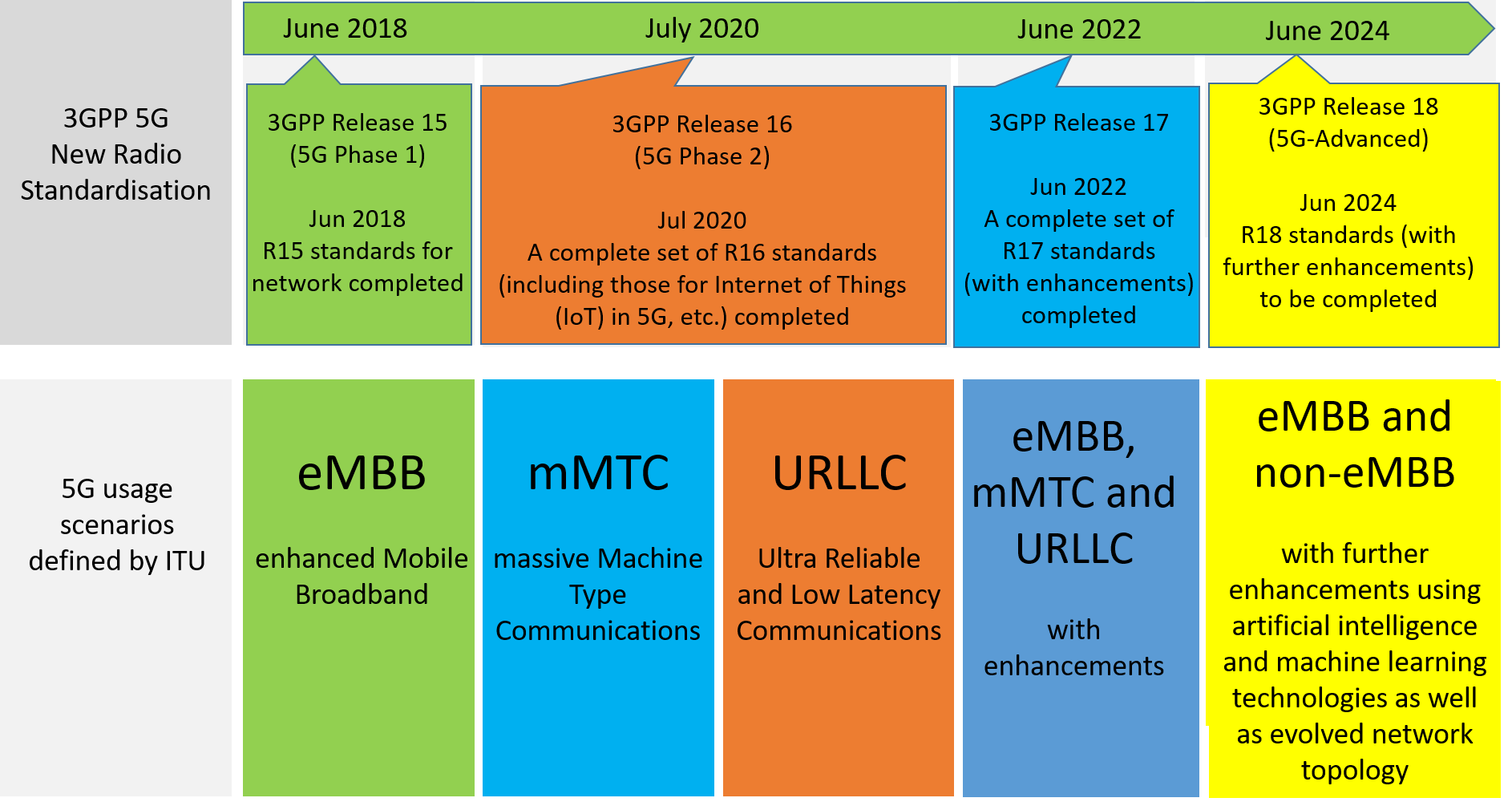 - Release 18 covers further enhancements to eMBB and non-eMBB with the use of artificial intelligence and machine learning technologies as well as evolved network topology. It is planned to be completed in June 2024.