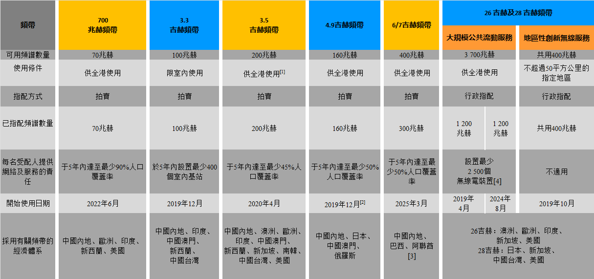 [3] 通訊局已在 2024 年11月舉行6/7 吉赫頻帶的頻譜拍賣,並將於 2025 年3月31日或之前指配有關頻譜。